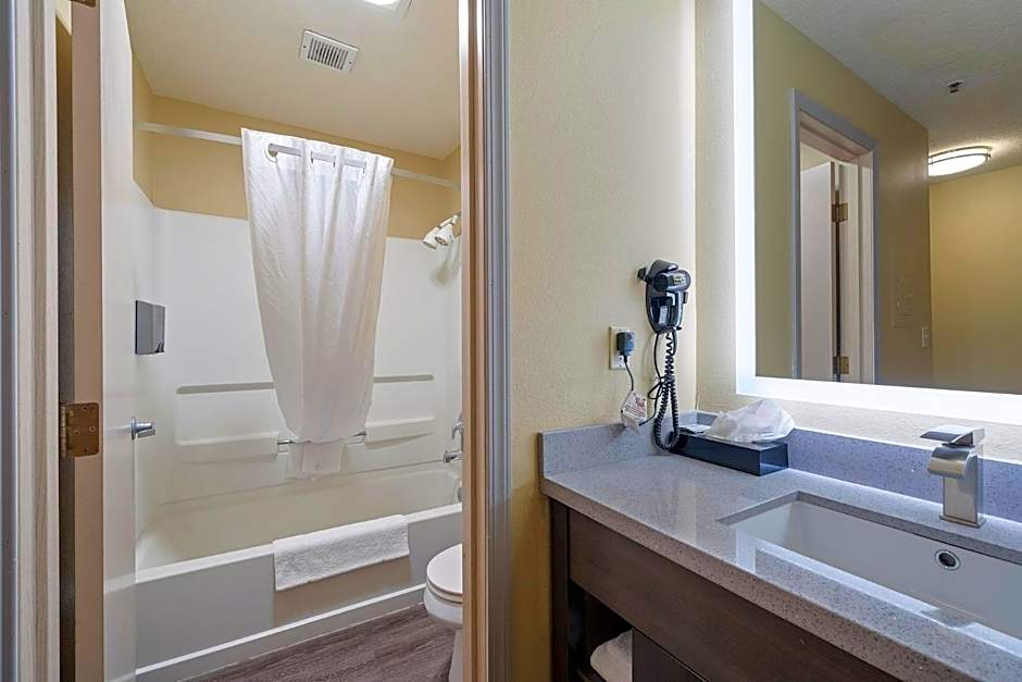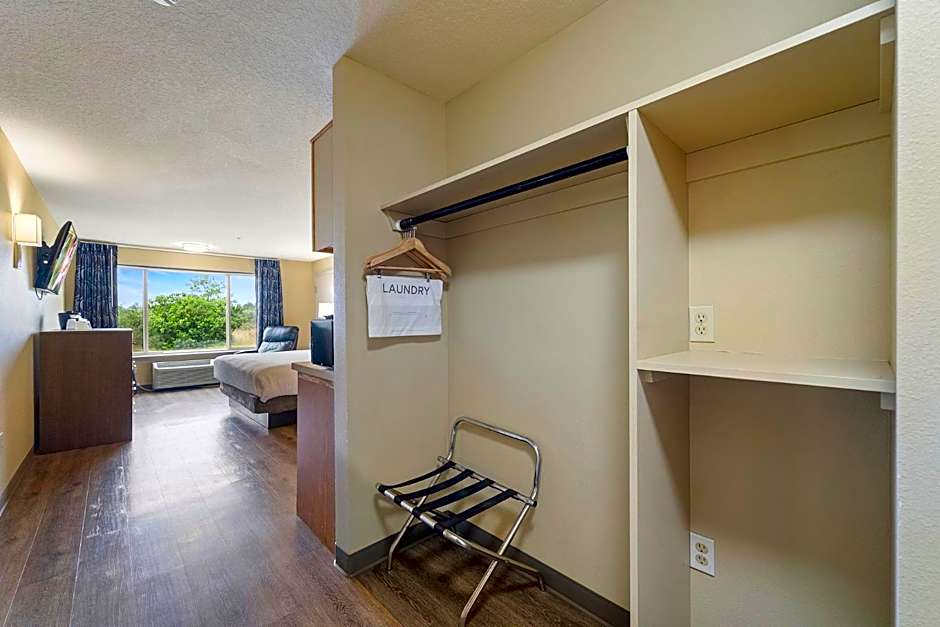 This single queen room: has a 47" flat-screen TV, desk, refrigerator, microwave, and coffee maker.